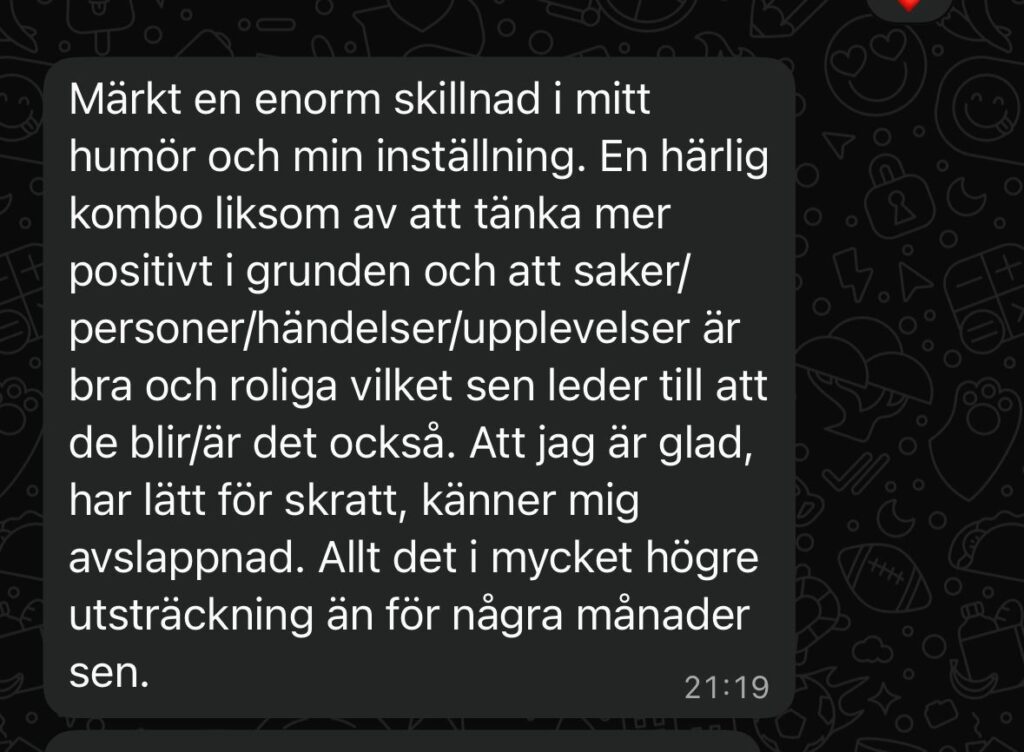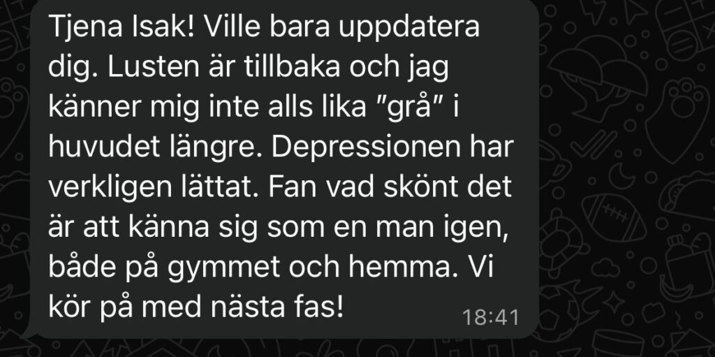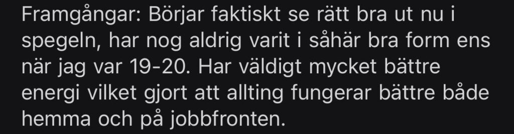 Resultat: Normaliserade testosteronvärden och sänkt östradiol. Kraftigt förbättrad kroppskomposition samt mående med ökad livslust och energi.