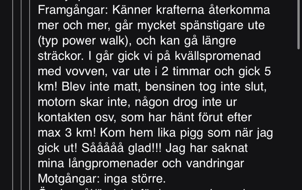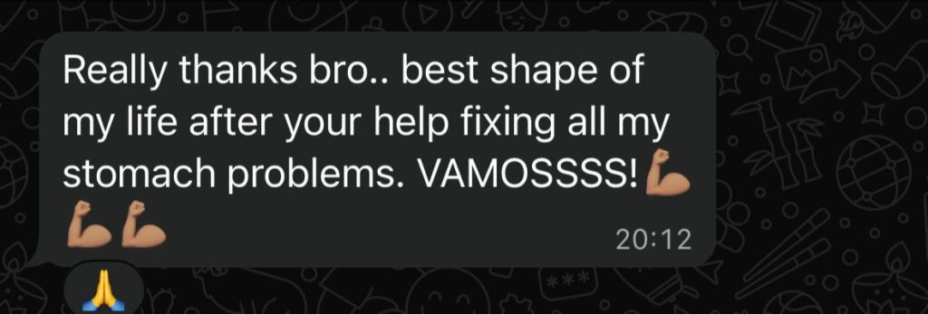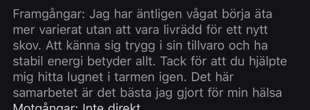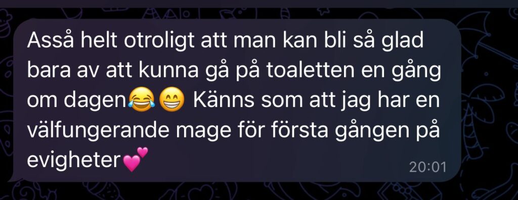 Resultat: Från 2 toalettbesök per vecka till 1 besök om dagen. Kraftigt förbättrad symptombild med hanterbara mängder gaser och negativ SIBO. Kraftig reducering av bukfett.