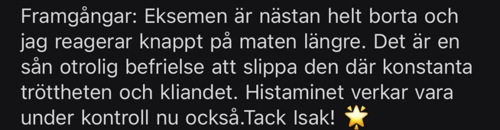 Resultat: Kraftig reducering av eksem och histaminkänslighet. Tydlig förbättring i energinivåer.