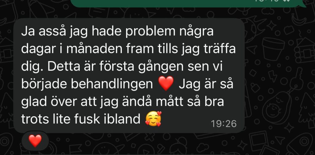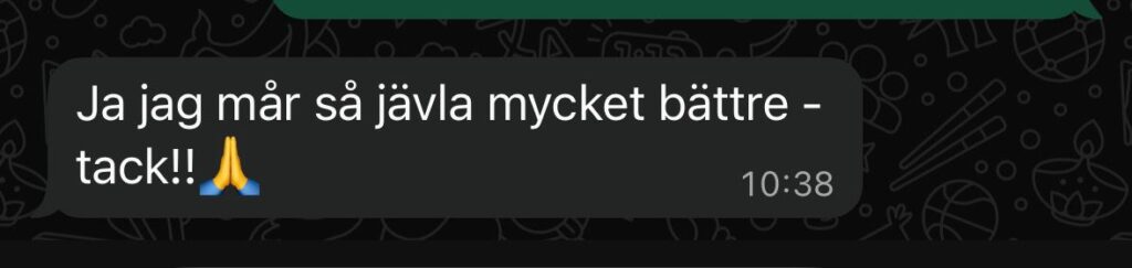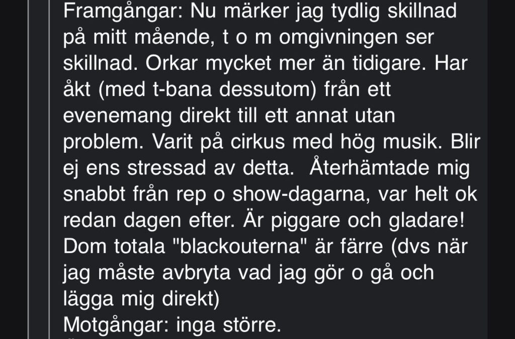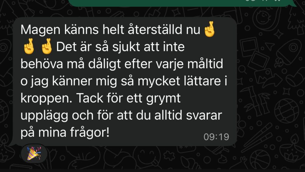 Resultat: Stabiliserad tarmfunktion, normaliserade energinivåer, minskad uppblåsthet, negativ SIBO.