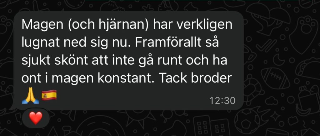 Resultat: Negativ SIBO, platt mage efter matintag. Helt upphört med rapningar.